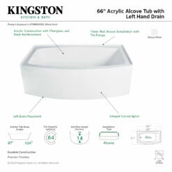 Create lasting memories of bubble baths with your children or relax from the stresses of the day with a top-notch alcove tub by Kingston Brass. Extremely user-friendly with effortless installation and simplistic construction, the alcove tub is the perfect addition to your home if you are looking for pristine performance and polished refinery. The Aqua Eden 66-inch acrylic curved apron alcove tub will wholly beautify your home for years to come thanks to its durable and easily repairable acrylic construction. This bathtub is finished inside and out in a brilliant, high-gloss white that ensures crisp aesthetics and easy care now and well in the future.