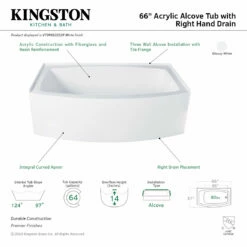Create lasting memories of bubble baths with your children or relax from the stresses of the day with a top-notch alcove tub by Kingston Brass. Extremely user-friendly with effortless installation and simplistic construction, the alcove tub is the perfect addition to your home if you are looking for pristine performance and polished refinery. The Aqua Eden 66-inch acrylic curved apron alcove tub will wholly beautify your home for years to come thanks to its durable and easily repairable acrylic construction. This bathtub is finished inside and out in a brilliant, high-gloss white that ensures crisp aesthetics and easy care now and well in the future.