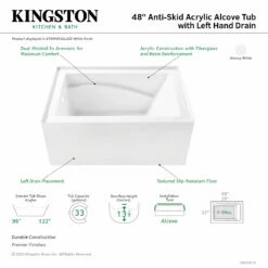 Create lasting memories of bubble baths with your children or relax from the stresses of the day with a top-notch alcove tub by Kingston Brass. Extremely user-friendly with effortless installation and uncomplicated construction, the alcove tub is the perfect addition to your home if you are looking for pristine performance and polished refinery. The Oriel 48-inch anti-skid acrylic alcove tub with left hand drain will wholly beautify your home for years to come thanks to its durable and easily repairable acrylic construction. This bathtub is finished inside and out in a brilliant, high-gloss white that ensures crisp aesthetics and easy care now and well in the future.