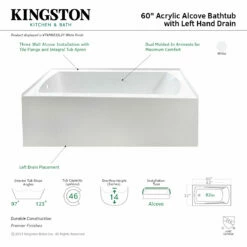 Create lasting memories of bubble baths with your children or relax from the stresses of the day with a top-notch alcove tub by Kingston Brass. Extremely user-friendly with effortless installation and simplistic construction, the alcove tub is the perfect addition to your home if you are looking for pristine performance and polished refinery. The Aqua Eden 60-inch acrylic alcove tub with arm rest will wholly beautify your home for years to come thanks to its durable and easily repairable acrylic construction. This bathtub is finished inside and out in a brilliant, high-gloss white that ensures crisp aesthetics and easy care now and well in the future.