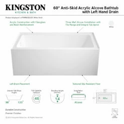 Create lasting memories of bubble baths with your children or relax from the stresses of the day with a top-notch alcove tub by Kingston Brass. Extremely user-friendly with effortless installation and simplistic construction, the alcove tub is the perfect addition to your home if you are looking for pristine performance and polished refinery. The Aqua Eden 60-inch anti-skid acrylic alcove tub will wholly beautify your home for years to come thanks to its durable and easily repairable acrylic construction. This bathtub is finished inside and out in a brilliant, high-gloss white that ensures crisp aesthetics and easy care now and well in the future.