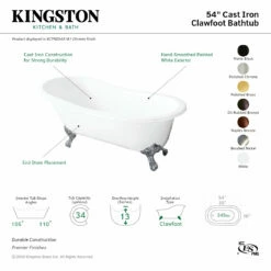 Surround yourself with the perfumed aroma of your favorite candle, grab your favorite piece of literature, and soak all of the stresses of the day away with the all-encompassing embrace of one of Kingston Brass’ finest products, the clawfoot tub. Since the late 19th century, the claw foot tub has stood prominent among bathroom fixtures for its outstanding grandeur. The Aqua Eden 54-inch cast iron slipper clawfoot tub without faucet drillings will wholly beautify your home for years to come thanks to its durable and heavy cast iron construction. Elegantly crafted clawfoot tub feet are included to further elevate your home’s traditional eminence. Aside from its feet, this bathtub is enameled in glossy white for a classic look, exceptional durability, and easy care and maintenance for years to come.